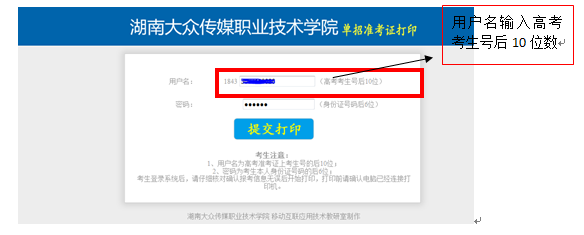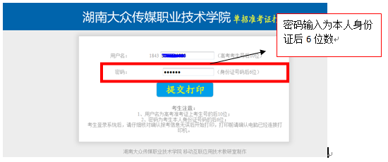 3、进入单招准考证打印页面,用户名输入考生号后10位,密码输入身份证号后6位,点击“提交打印”