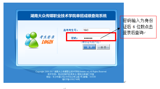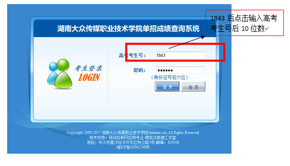 3.进入成绩查询页面,输入高考考生号后10位,密码输入身份证号后6位,点击“登录”