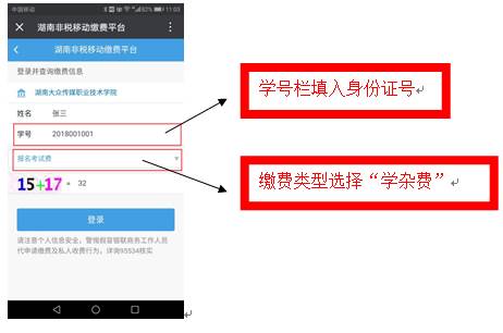 3、然后进入登录界面,输入考生姓名、学号栏填入身份证号,在此选择缴费类型“学杂费”,缴费类型有“学杂费”、 、“重修费”、“报名考试费”、“其他费用”。缴费时请选择相应缴费类型(默认为学杂费)。