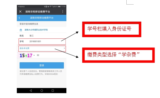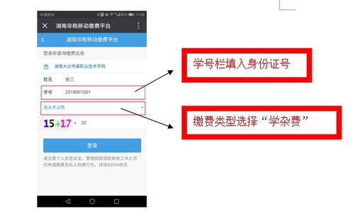 3、然后进入登录界面,输入考生姓名、学号栏填入身份证号,在此选择缴费类型“学杂费”,缴费类型有“学杂费”、、“重修费”、“报名考试费”、“其他费用”。缴费时请选择相应缴费类型(默认为学杂费)。