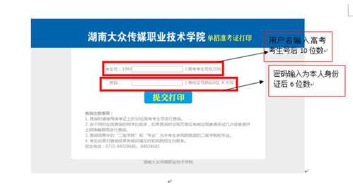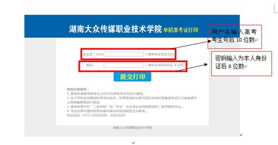 3、进入单招准考证打印页面,用户名输入考生号后10位,密码输入身份证号后6位,点击“提交打印”