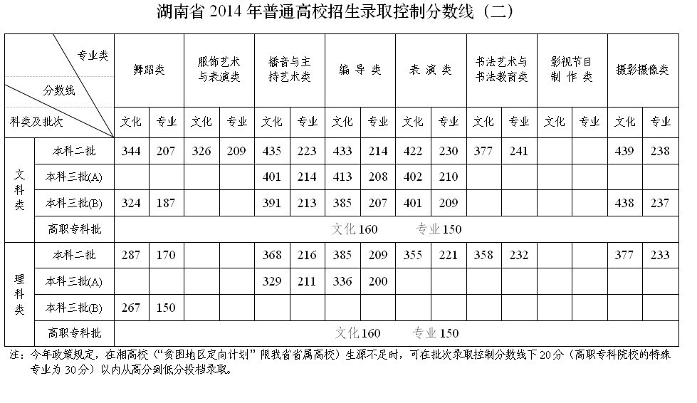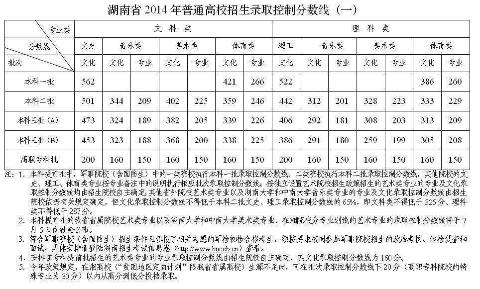 湖南省2014年普通高校招生录取控制分数线