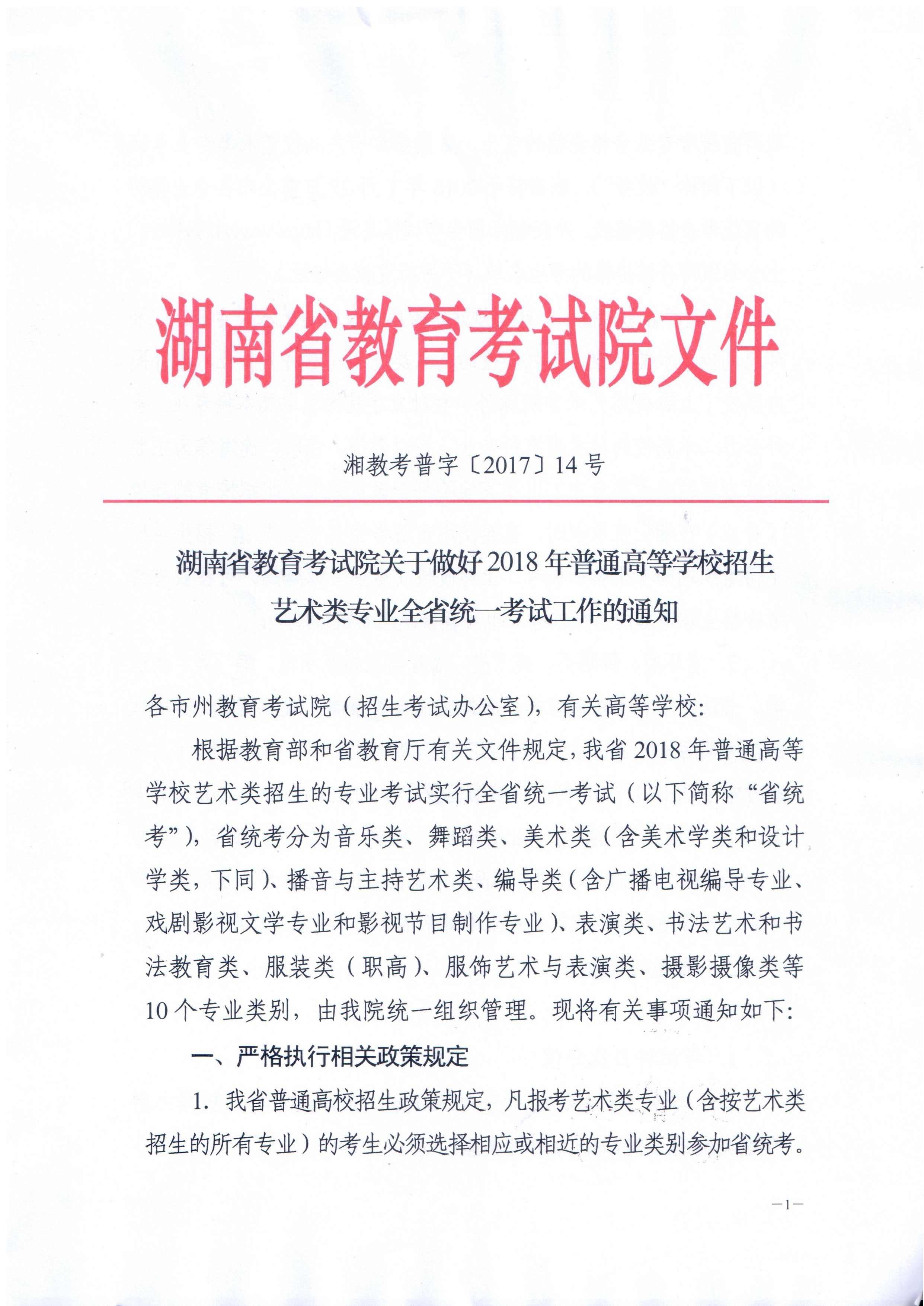 关于做好2018年普通高等学校招生艺术类专业全省统一考试工作的通知