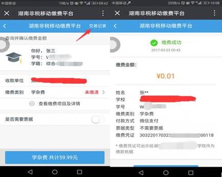 6、缴费记录查询:在学生登录后,点击右上角的“交易记录”。