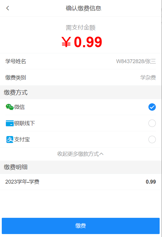 5、确认订单明细和金额,选择缴费方式后点击缴费;