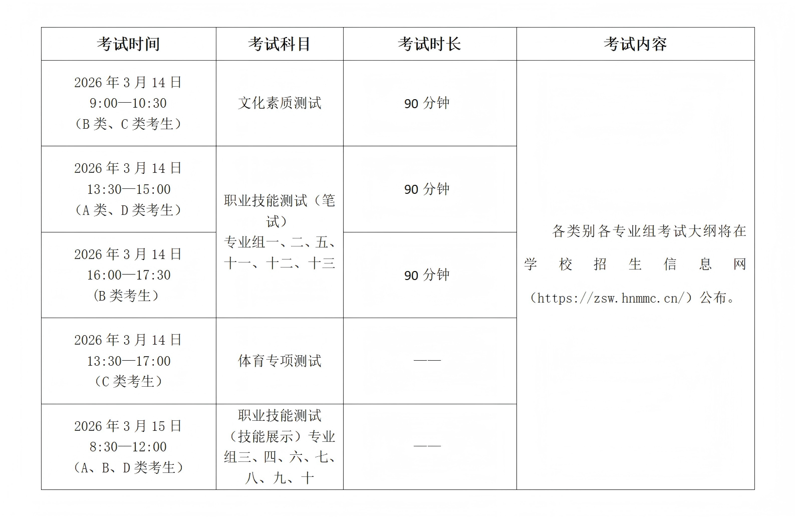 3.C类考生。学校依据《湖南大众传媒职业技术学院2026年体育特长生单招方案》统一组织文化素质测试和专业测试。文化素质测试主要依据《中等职业学校公共基础课课程标准》及高中教育阶段语文、数学、英语等有关内容进行命题及考试,采取笔试方式进行,满分300分。专业测试按照《湖南大众传媒职业技术学院2026年体育特长生单招方案》执行,满分300分。